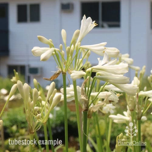 APPEARANCE :Compact agapanthus with a long flowering season of ice-white blooms subtly tipped in pale blue. Florets have slightly ruffled petals in bud