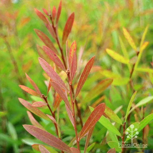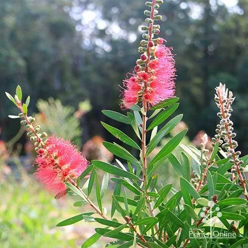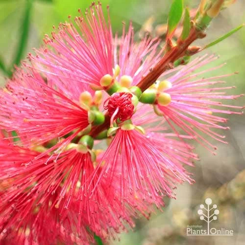 APPEARANCE : Ozbreed variety. Native shrub with small leaves and dark pink bottlebrush flowers tipped in gold during spring.
