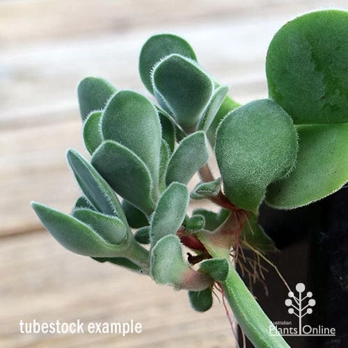 DESCRIPTION: Low-growing carpet forming succulent. Spreading stems covered with fat fleshy oval leaves, grey green in colour. Leaf edges may colour with a pink blush in strong light. Will develop a long flowerstem with broccoli-like florets on when mature and happy.
