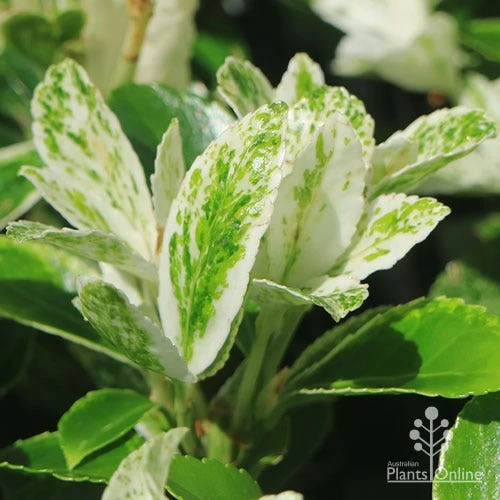 DESCRIPTION: Hardy evergreen compact shrub with dark green older foliage and pure white new tips which mature to white splashes on older leaves. Upright and dense.