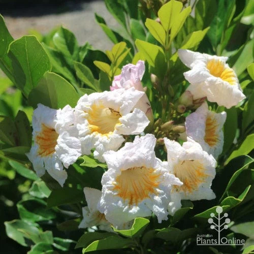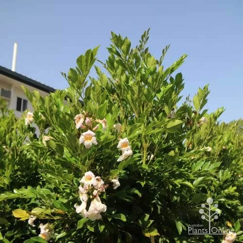 APPEARANCE : Glossy evergreen leaves, clusters of pale-pink-white-gold, lightly-scented trumpet flowers in warm months through the year.